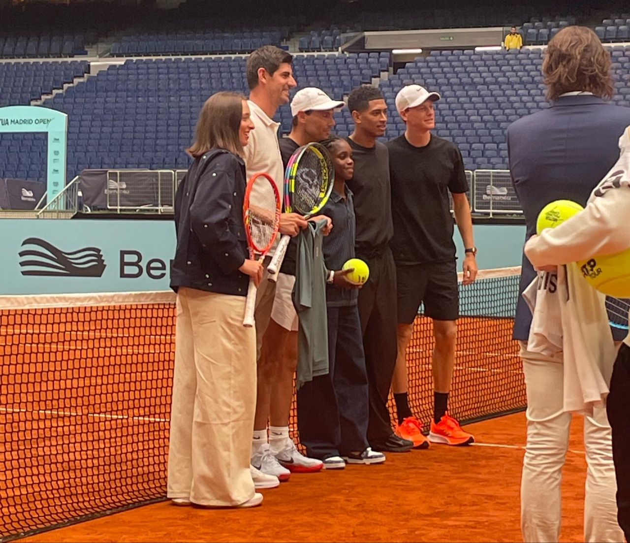 04月23日讯 马德里大师赛进行期间,一场别开生面的网球友谊赛在伯纳乌展开,对阵双方是辛纳+贝林厄姆vs库尔图瓦+纳达尔,担任主裁判的是皇马主席弗洛伦蒂诺。